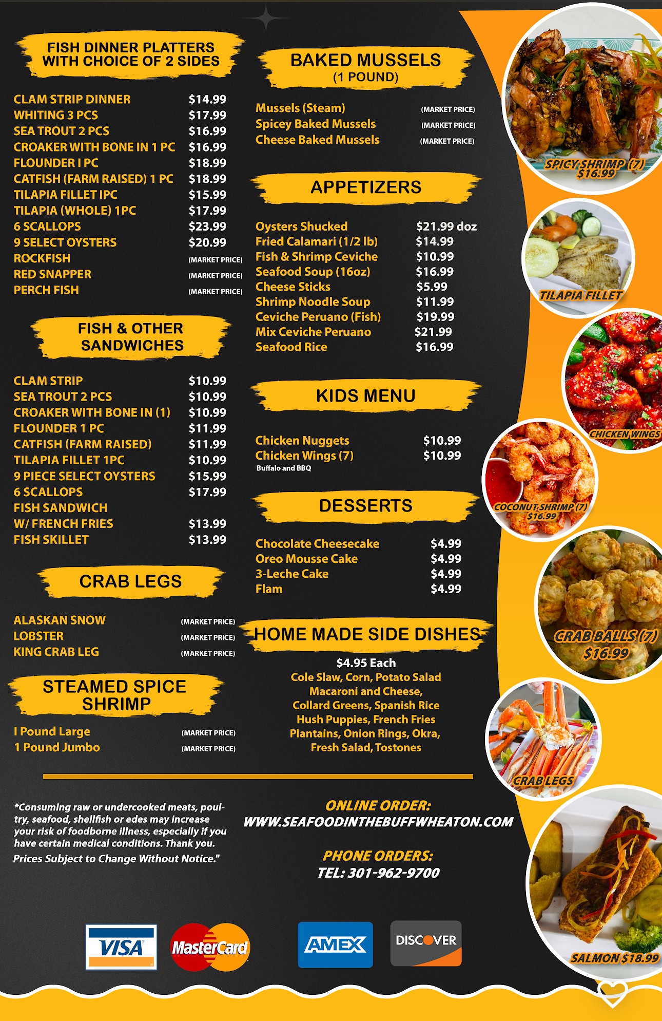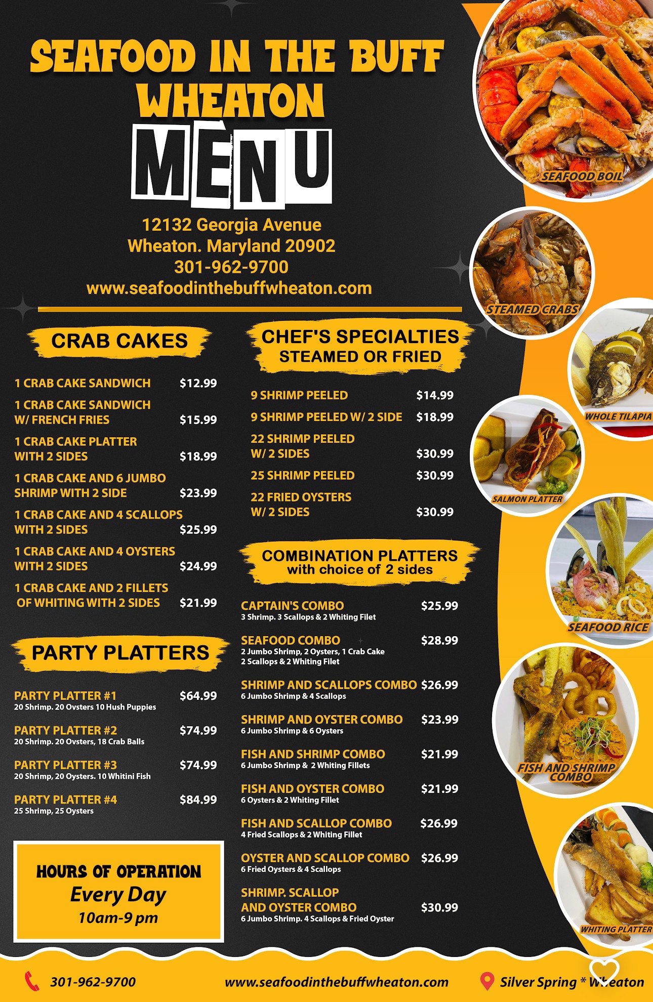 Situated in the heart of Wheaton, Maryland, Seafood in the Buff Wheaton has grown into a welcoming space for families, friends, and seafood fans of all kinds. Our team takes pride in crafting dishes that highlight the very best the ocean offers. From tender lobster tails to authentic crab cakes, every item is prepared with care and skill so that each bite delivers true satisfaction. Here, seafood is more than a meal, it is an experience built on tradition, passion, and quality.